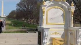 Возле Мемориала Линкольна в Вашингтоне разместили огромный золотой унитаз для президента США Дональда Трампа. На табличке написано: "Трон, достойный короля".