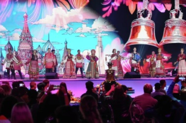 Делегации из стран, участвующих в "Интервидении", рассаживались за столами с традиционными русскими угощениями и пили чай.