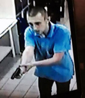 На видео видно, как в супермаркет зашел вооруженный пистолетом мужчина, а за ним - еще двое неизвестных.