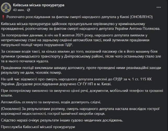 Однако официальные ресурсы партии "Слуга народа" подтвердили смерть Полякова.