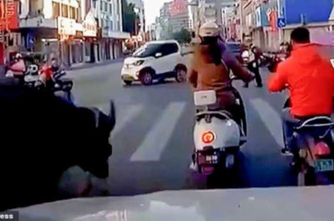 В Китае в городском округе Юйлинь в Гуанси-Чжуанском автономном районе сбежавший буйвол сбил женщину со скутера и ранил еще семь человек. Видео с места происшествия опубликовало издание Daily Mail.