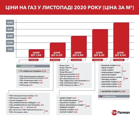 Как говорится в отчете информационно-консультационного центра ГазПравда, самая низкая цена — у газоснабжающей компании "Нафтогаз Украины". Она предложила топливо в ноябре по 6,33 грн за кубометр.