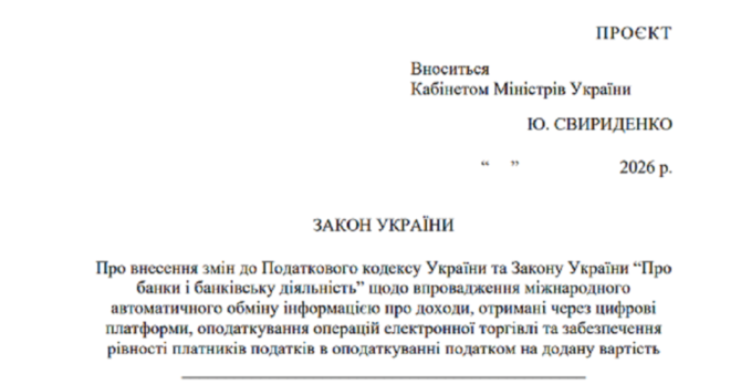 Сегодня документ под названием "О внесении изменений в Налоговый кодекс Украины и закон Украины "О банках и банковской деятельности" по внедрению международного автоматического обмена информацией о доходах, полученных через цифровые платформы, налогообложение операций электронной торговли и обеспечения равенства налогоплательщиков в налогообложении налогом на добавленную стоимость" появился на сайте Минфина.