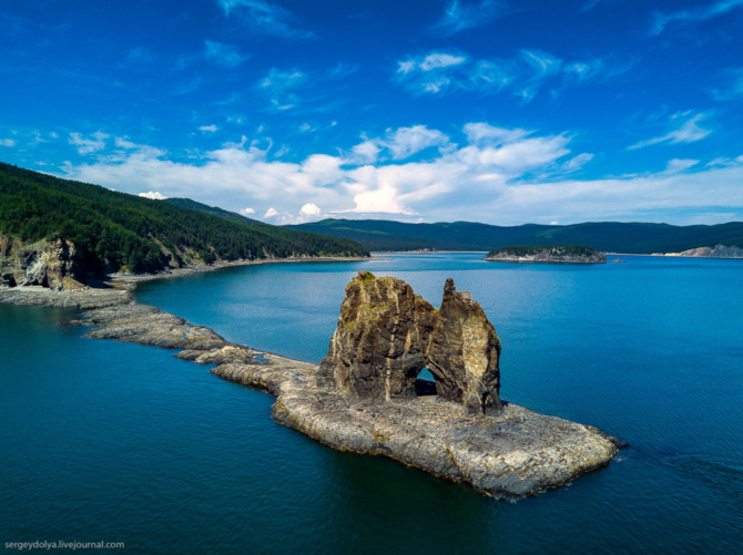 Очень много живописных арок. Самая известная называется «Окно в Шантары» и находится по пути из Хабаровска в центр Шантарского архипелага: