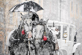 Запряженные в карету лошади во время снегопада в Кракове, Польша.