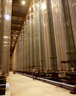 Впрочем, как бы я ни стебался над могучестью атомной Европы, но в нулевые годы их надкритичные центрифуги стали всерьез беспокоить Росатом. Давайте напоследок еще немножко технических деталей. Надкритичная центрифуга разделяет большее количество урана, чем подкритичная - соответственно, в каскадах их требуется не такое большое количество. Это - плюс. Но выход из строя, авария надкритичной центрифуги вынуждает останавливать весь каскад - ведь выключается механизм, который выполняет большую работу. При этом надкритичные центрифуги в 2-3 раза длиннее, выше, чем подкритичные. Что это значит с технической точки зрения? Длиннее "игла" - значит, ее сложнее удерживать в равновесии, выше требования к ее материалу. Росатом не торопясь, без суеты одолел все эти проблемы - в 2012 году запущены центрифуги 10 поколения - надкритичные. В открытых СМИ нет ни одной фотографии этой новинки, потому об их размерах нам позволено только гадать. Но, вероятнее всего, это те же 2-3 метра, как и центрифуги URENCO. Конкуренция продолжается, но на сегодня Европа и Россия находятся на тех же позициях: Росатом в одиночку опережает 4 европейские державы в полтора раза, и пока никаких перспектив изменения этой пропорции не предвидится.