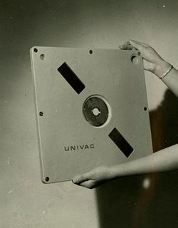 Достойный джентельмен J. Presper Eckert (это тот Эккерт, который с Моучли насоздавал ENIACa c UNIVACами) описал этот Univac removeable disc cartridge, в своей речи "Industry Science & Technology in Last Third of the Century" в 1966 году, как "A small removable disc cartridge shown..." A small! A SMALL, Карлы!! Чуете всю силу и мощь 60-х :) Они сначала поставлялись с миникомпьютером UTS 700 и были на 0,25 Мб одинарной плотности и 0,5 Мб двойной. В качестве основы использовался стандартный 15" магнитный диск от фонографов, только крутили они их не на 45 оборотов, как рекомендовано в святых книгах аудиоинжинеров, а по хардкору на все 360!