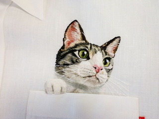 Тот самый первый «котик из кармана» был сделан в далеком 2013 году, и за три года Хироко Кубота (Hiroko Kubota) вышила немало домашних питомцев – от сердитых беспородных котов до удивленно смотрящих чихуахуа и французских бульдогов. Сейчас это уже не просто шитье на дому, Хироко организовала собственный бренд под названием Go!Go!5, и получить заказы можно не только внутри самой Японии, но и за ее пределами. Животные получаются очень похожими на настоящих, разве только очень миниатюрные – в большинстве своем вышитые животные как бы выглядывают из нагрудного кармана, хотя иногда Хироко делает котиков, «прячущихся» под застежкой рубашки. Иногда для большей реалистичности Хироко так же придает дополнительный объем изображению, изображая котов, держащих карман лапкой.