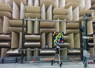 Собранная из «пикселей» голограмма во время тестирования. Стена обладает необычной формой для эффективного поглощения звуков — отраженные волны могут помешать эксперименту. Duke University