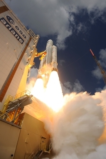 А на этом фото мы почти можем заглянуть внутрь работающего двигателя. Центральный блок Ariane V работает на топливной паре водород/кислород, которые дают практически бесцветное пламя. Боковые ускорители твердотопливные, их пламя очень яркое, с большим количеством дыма, но у работающего по центру двигателя сквозь пламя хорошо видна внутренняя поверхность сопла. Шары около сопла - шар-баллоны системы наддува баков, там находится гелий под высоким давлением.
