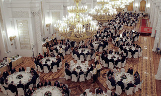 Советская традиция кремлевских застолий окончательно ушла в прошлое с приходом команды Путина. В 2000-х поменялся не только стол. Поменялось все. Вместо «кораблей» появились круглые столы, кресла с чехлами, скатерти. Мы ушли от накрытия в стол. На столе оставались только маленькие пирожки и немного фруктов. Вся остальная подача стала порционной. Сегодня при так называемом полном приеме обычно идут две закуски (рыбная и мясная), два горячих (тоже рыбное и мясное) и один десерт. Алкоголя на столе нет, он только на обливе.