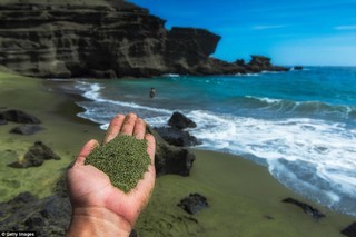 Пляж Папаколеа-Бич, Гавайи незабываем благодаря своему отличительному зеленому песку, цвет которого обусловлен выветриванием толеита базальта.