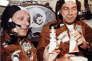 Во время экспериментального полета «Союз» — «Аполлон» 1975 года советские космонавты впервые столовались с американцами. И угостили их говяжьим языком, рижским хлебом и… водкой. По крайней мере об этом свидетельствовали этикетки на нескольких тюбиках.
