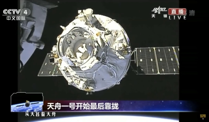 "Тяньчжоу-1" за мгновения до стыковки, кадр из видео CCTV4