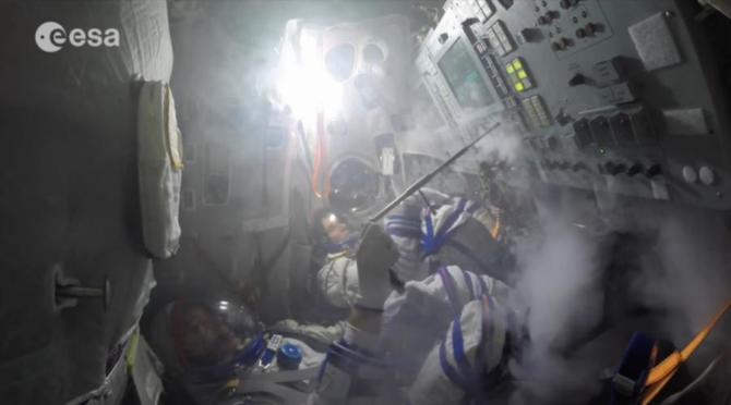 Тренировка на тренажере "Союза", кадр из видео ESA