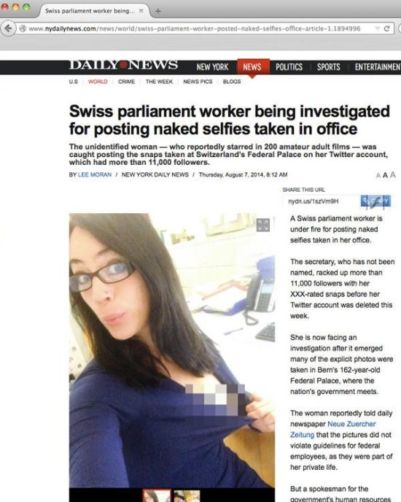 В американских и европейских СМИ действуют совершенно разные критерии цензуры, и этот пост наглядно объяснит суть этой разницы. Недавно стало известно о том, что одна из сотрудниц парламента Швеции делала непристойные селфи на рабочем месте. Предлагаем взглянуть на то, как одну из фотографий героини скандала показали в американских и европейских СМИ.