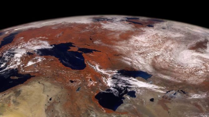 Коричневая цветовая гамма — это не повод сокрушаться о сведенных лесах и опустынивании планеты, а результат захвата камерой спутника света в ближнем инфракрасном диапазоне спектра. Наблюдаемая на фото краснота — это хлорофилл живой растительности, который эффективно отражает инфракрасный свет. Чтобы вернуть привычную зелень, приходится шаманить в фотошопе.