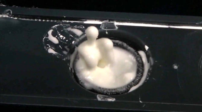 Любопытные эффекты начинаются, если на динамиках для ноутбука мы заменим воду на (в данном случае - раствор крахмала консистенции блинного теста). У неньютоновской жидкости вязкость зависит от градиента скорости. Кукурузный крахмал увеличивает свою вязкость при сдвиге, поэтому на вибрирующем динамике часть раствора будет вести себя как твердое тело и будет стремиться улететь прочь. Но удалившись от источника вибрации раствор снова станет жидкостью и начнет испытывать силы поверхностного натяжения, которые будут стремиться затащить его обратно в динамики. В результате появляется сложная форма, которая будет изменять свой внешний вид и достаточно далеко удаляться от динамика, как будто нечто живое.
