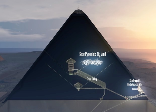 Внутри пирамиды Хеопса на сегодняшний день известно три погребальные камеры — недостроенная погребальная «яма», «Камера царя», где размещен пустой гранитный саркофаг, и «Камера царицы». К камере фараона ведет Большая галерея — высокий наклонный туннель длиной 46,6 метра. В прошлом году археологи также заявили, что им удалось обнаружить две пустоты — одна из них находится над Большой галереей, а другая, получившая название Северный коридор, располагается над современным входом в пирамиду. Однако некоторые ученые выражали сомнения по поводу достоверности находки, считая, что некоторые части пирамиды могли быть сделаны из другого типа камней.