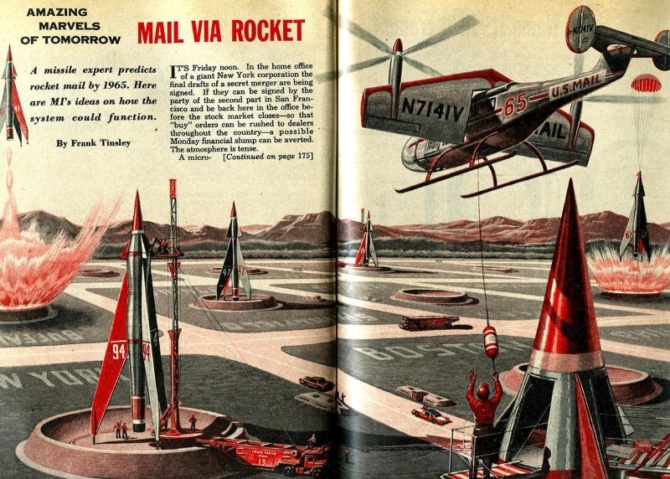 Некоторые энтузиасты вроде главы Марсианского общества Роберта Зубрина верят в ракетную почту и сегодня, а после реанимации идеи суборбитальных пассажирских ракет Маском на 68 Международном астронавтическом конгрессе будет забавно услышать в 2018 году от него и о грузовых/почтовых ракетах, но на мой взгляд реализация в обозримом будущем ракетной почты крайне маловероятна. Информация мгновенно и за копейки передается по Интернету, а для материальных предметов стоимость доставки обычно важнее скорости. Надежды на рынок элитных бизнес-отправлений нет - таких заявок не будет много. Немного жаль, что эта красивая идея мирного использования ракет оказалась ошибочной, но у ракет хватает работы в космосе, а красивую картинку мы легко можем увидеть в фантастике. Вот, например, очень забавная ракетная почта в (с 2:28).