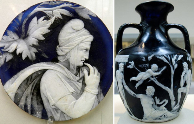 Эта двуручную амфору обнаружили в гробнице римского императора Александра Севера, чье захоронение находится недалеко от Рима. Археологическая находка сразу же заинтересовала стеклодувов и мастеров, работающих с фарфором, а также - искусствоведов. Ваза была изготовлена из двух слоев стекла - из непрозрачного белого и темно-синего. Далее синий слой срезан таким образом, чтобы из проглядывающего белого слоя образовались изображения. Какие сцены запечатлели античные мастера, остается загадкой.