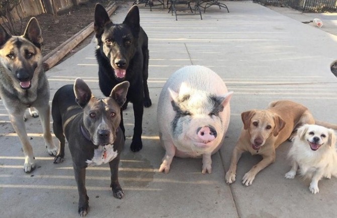 Поросенок, выросший в окружении собак.