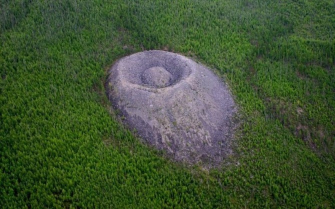 В 1949 году геолог Вадим Колпаков обнаружил большой конус из известняковых глыб на севере Иркутской области в 360 км от районного центра г. Бодайбо. Конус имел любопытную и даже забавную форму: его вершину венчает кратер, в центре которого высится горка высотой около 12 метров. Высота же всей насыпи составляет около 40 метров, ширина 100 метров у основания, а диаметр по гребню – 76 метров.