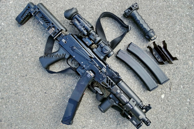 Пистолет-пулемет имеет складывающийся приклад и два варианта установки планки Пикаттини — на крышке ствольной коробки и на боку.