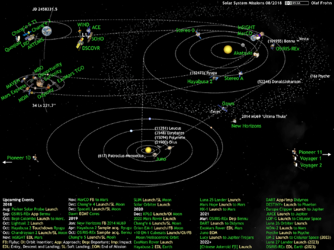 И наконец, на последнем изображении традиционная ежемесячная инфографика от Планетарного сообщества. На ней показаны все действующие межпланетные миссии по состоянию на 1 августа 2018 года. Не исключено, что это последняя подобная инфографика, где можно увидеть аппарат Dawn. Он практически исчерпал все запасы топлива и по разным оценкам, ему осталось от нескольких недель до нескольких месяцев работы.