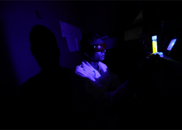 Группа американских ученых из Толедского университета под руководством Ажита Карунаратне (Ajith Karunarathne) впервые подробно изучила биохимические механизмы, из-за которых облучение ярким синим светом может быть опасно для клеток сетчатки. Поглощение глазом света происходит в рецепторных клетках, в которых есть светочувствительные белки — . В результате поглощения света хромофор , с которым белок связан ковалентной связью, переходит в транс-форму и передает таким образом сигнал нервным клеткам. После этого благодаря работе фермента ретинальдегид-дегидрогеназы и нескольких молекул-переносчиков хромофор возвращается обратно в цис-форму и готов вновь поглощать фотоны.