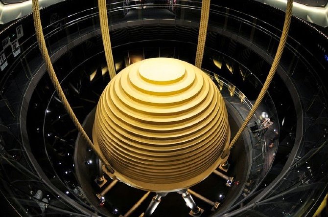 В 2004 году самым высоким зданием в мире была 509-метровая башня Тайбэй 101 в Китае. Внутри этого здания установлен гигантский противовес в виде шара, характеристики которого поражают воображение! Его диаметр равен — 5.5 метров, а вес — 728 тонн. Шар способен гасить колебания небоскреба, даже если скорость ветра составляет 240 км/час.