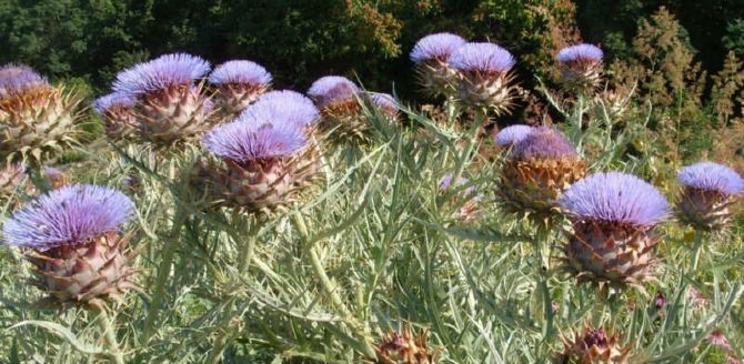 Кто бы мог подумать, что артишок — в первую очередь эффектный фиолетовый цветок? Верхнее фото демонстрирует цветущее растение, а нижнее — продукт в процессе приготовления.