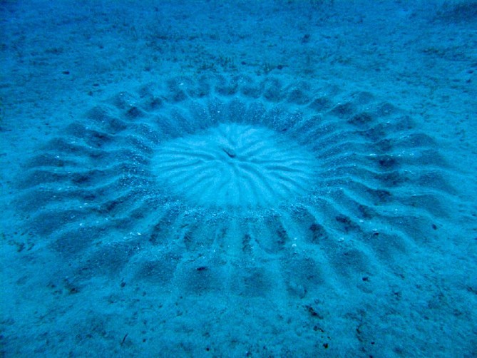 В 1995 году на морском дне у берегов японского острова Осима дайверы нашли странный след: правильный круг размером около двух метров. В его середине был участок с особенно чистым и мягким песком, а во все стороны от него расходились аккуратные борозды.