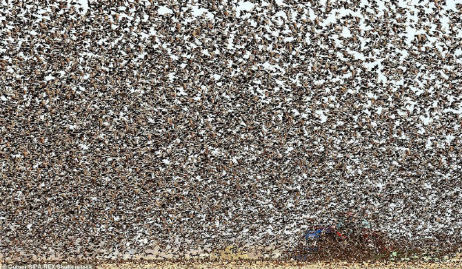 На фотографиях можно заметить, что скворцов так много, что не видно трактора, который пытается пересечь поле. Стая птиц почти полностью блокирует ему видимость.
