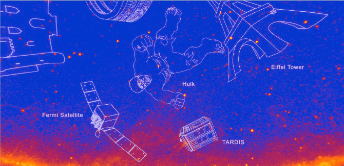 Телескоп FERMI в этом году отмечает десятилетие успешной работы. За это время число новых гамма-источников, зафиксированных с его помощью, приблизилось к трём тысячам. В честь этого события астрономы NASA решили сгруппировать все известные гамма-источники в подобие созвездий и дать им неофициальные названия. Напомним, что «официальных» созвездий, делящих небосвод на отдельные регионы, насчитывается 88. Если классические созвездия носят по большей части названия животных или мифических героев, то к процессу присвоения имён новым «гамма-созвездиям» астрономы подошли с юмором, увековечив современных героев культуры и научные достижения, так или иначе связанные с темой гамма-телескопа.