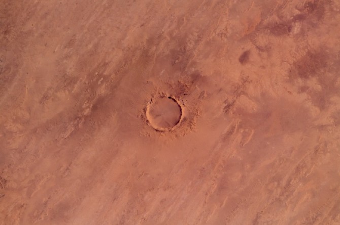 Снимки были с борта МКС астронавтом Александром Герстом. Он сфотографировал кратер Тенумер, расположенный на территории Мавритании в пустыне Сахара.