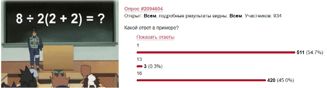 Вчера опубликовал в блоге простую задачку, на которую ответили почти 1000 человек. Мнение у людей разделились как и во всем интернете: половина утверждает, что ответ "1" , а другая половина уверена, что ответ "16".