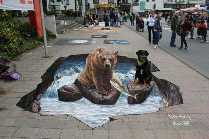 3D-стрит-арт настолько захватывает воображение и дает такой большой приток зевак и туристов, что мгновенно становится местной достопримечательностью. А если увидеть эти реалистичные водопады, обрывы и мосты живьем, просто взрывается мозг.