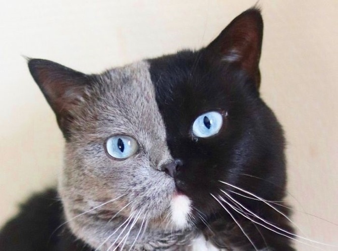 Этот кот – настоящее чудо природы. На первый взгляд даже кажется, что это чья-то шутка: ровно посередине морды провели чёткую линию, после чего одну половину выкрасили в черный цвет, а другую – в светло-серый.