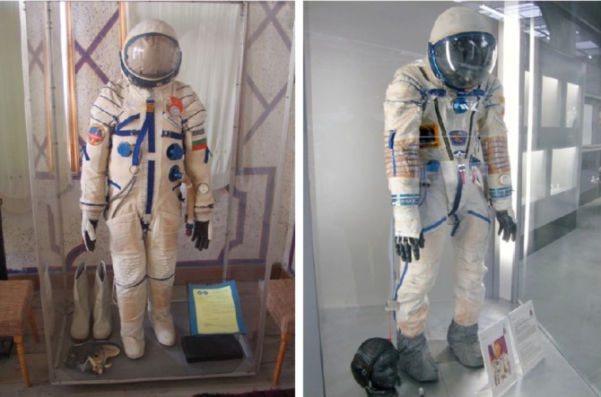 Справа: скафандр "Сокол КВ-2", эксплуатируется с 1980 года, начиная с полёта космического корабля "Союз Т-2"