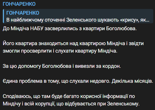 НАБУ около трех месяцев прослушивало квартиру Миндича, в которой мог быть записан и Зеленский, через квартиру Боголюбова. За помощь в этом деле сотрудники НАБУ затем помогли Боголюбову выехать за границу, сообщает нардеп Алексей Гончаренко.