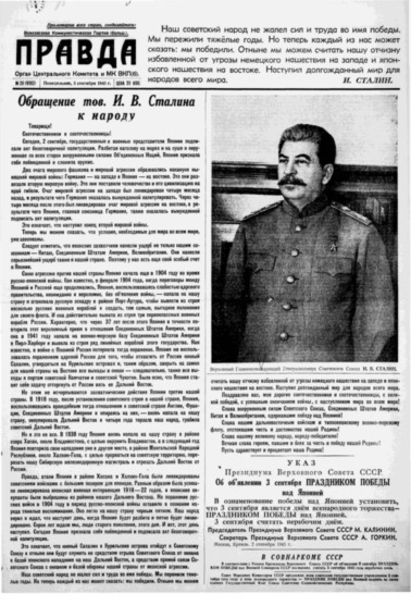 Тем временем 2 сентября на борту американского линкора "Миссури" представители США, Великобритании, СССР, Франции и Японии официально подписали акт о капитуляции японских вооруженных сил. В Москву новость об окончании войны пришла на следующий день, и в ознаменование этого события 3 сентября объявили праздничным днем (правда, праздник продержался лишь два года, потом вместо него выходным стало 1 января).