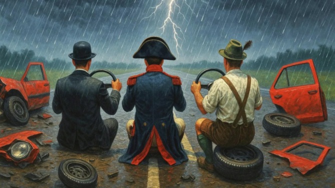 Растерянность "коалиции желающих" накануне предстоящей в четверг встречи в Париже с Трампом и Зеленским живо напоминает эпизод из "Кавказской пленницы", когда Трус, Балбес и Бывалый пытаются перегородить дорогу грузовику.