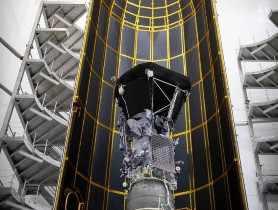 Представленная фотография 16 июля в сборочном цехе Astrotech Space Operations на мысе Канаверал. В кадре можно увидеть аппарат Parker Solar Probe (PSP), размещенный внутри 19,1-метрового головного обтекателя ракеты Delta IV Heavy.