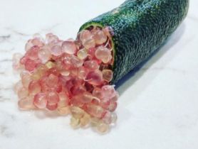 Это диковинное для нас растение называется пальчиковым лаймом и растет оно в Восточной Австралии. Внутри плодов с тонкой кожицей, которая может быть зелёного, жёлтого, оранжевого, бордового, красного, пурпурного, коричневого или чёрного цвета, находится мякоть, представляющая собой небольшие шарики с соком внутри.