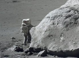 Историческое фото: геолог Харрисон Шмитт, единственный из учёных-землян, побывавший на другом небесном теле, исследует лунные скалы в декабре 1972 года, в ходе последней экспедиции "Аполлонов" на Луну.