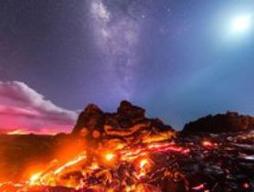 Потрясающий воображение снимок был сделан искателем приключений и фотографом Майком Мезеулом (Mike Mezeul) в Гавайском вулканическом национальном парке. На снимок Майка одновременно попали раскаленная вулканическая лава, Луна, звездное небо и Млечный путь. Для того чтобы сделать этот кадр Майк прошел пешком более 20 км, к тому же он очень рисковал, находясь так близко к лаве.