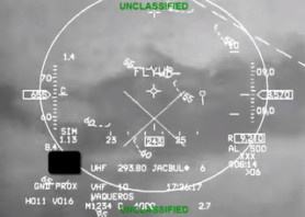 Момент включения системы Auto-GCAS. Большой белый крест чуть ниже середины экрана указывает расчетную точку столкновения истребителя F-16 с землей. В нижнем левом углу надпись GND PROX (ground proximity, близость земли) свидетельствует о срабатывании системы предупреждения о возможном столкновении с землей.