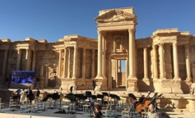 Телевизионная камера движется по полупустому римскому амфитеатру в Пальмире. Публика, среди которой есть и дети, без улыбок наблюдает за тем, как вооруженные мужчины патрулируют отведенные для них секторы.