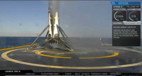 Первая ступень ракеты Falcon 9 успешно села на плавучую платформу. Космический корабль Dragon успешно запущен на околоземную орбиту, и сейчас движется к Международной космической станции. Корабль Dragon должен доставить на МКС 3,3 тонны груза, в том числе трансформируемый (надувной) экспериментальный модуль Beam. Надувной модуль заказан NASA у частной космической компании Bigelow Aerospace.